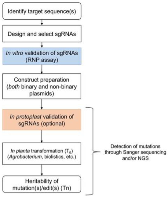 A stepwise approach for genome editing in various crop species. A series of different steps is followed for the selection of target sequences, the design of sgRNAs, and their validation in vitro or with protoplasts before stable transformation. Detection of the putative CRISPR/Cas9-mediated edits can be performed using Sanger sequencing or next-generation sequencing in T0 and subsequent generations. It is important to note that as the development pipeline primarily uses transgenic modification as a step in the production of genome-edited plants, the need to remove such modifications is a universal prerequisite for the different jurisdictions [10,16,17].