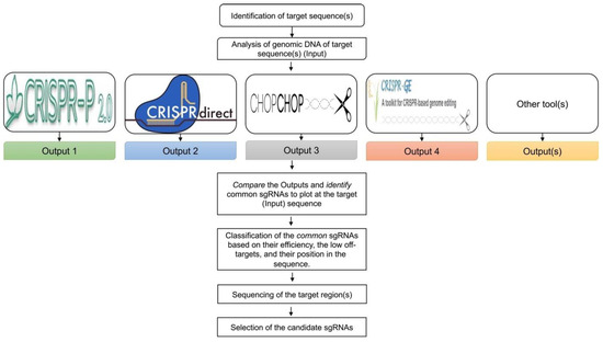 Design of sgRNAs. Analysis of the genomic DNA sequence of the respective target(s) can be performed through different web tools that are commonly used for the design of sgRNAs in plants. Comparison of the output of these databases results in the identification and selection of sgRNAs present in all the outputs. Classification of the common sgRNAs can be performed based on their efficiency, fewer potential off-target sites, and their position in the sequence. Before the final selection of the sgRNAs, sequencing of the target regions in the sgRNA region is recommended to ensure consistency between the in-silico and the actual cultivar sequence.