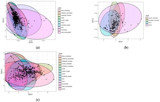 DCA characterizing species composition according to zones under different environmental conditions in (a) the ten zones sampled for three years, and (b) the case of the LZ-67 road with four zones monitored for one year, and (c) all fourteen zones for one year. Each point on the graph represents a position within a transect for each season and year.