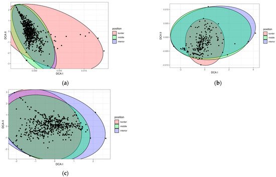 DCA based on species composition according to the position in respect to the road border in (a) the ten zones sampled for three years, (b) the case of LZ-67 road with four zones monitored for one year, and (c) all fourteen zones for one year. Each point on the graph represents a position within a transect for each season and year.