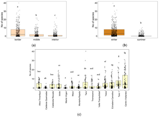 (a) Effect of the position (distance to the road: border, middle, or interior) on the number of species, (b) effect of the season (winter, summer) on the number of the species, (c) and effect of zones (Altos Timanfaya, Calderas Quemadas, Caldereta Riscada, Islote, Manto Virgen, Mazo, Montaña Rajada, Taro, Tremesana, Valle Tranquilidad, Yaiza, Echadero Camellos, Taro 1, and Centro Visitantes) following linear mixed-effect models with position, zone, season, and transect as random factors and Tukey post hoc test, p < 0.05. Different letters indicate significant differences between groups.