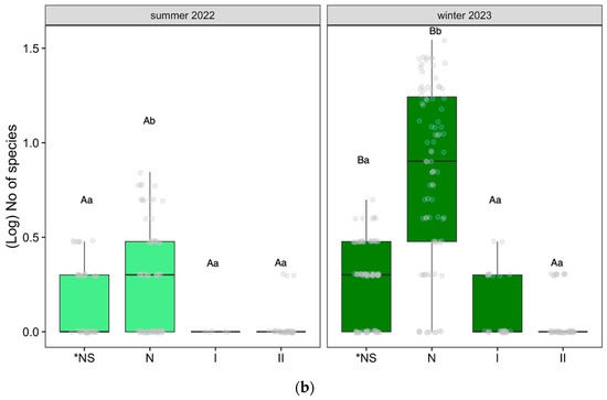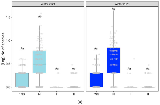 Considering the types of species categorized by their endemicity (as described in Table A1 and Table A4a,b), we analyzed the number of species across different areas and time periods in datasets 1 and 2. Referring to dataset 1, the ten zones where we worked for three years (Figure 4a) from winter 2021 to winter 2023, the number of endemic species (*NS), the rest of the native species (N), invasive species (II), and the remaining introduced species (I) remained stable. There were significant differences between the endemic species and the rest of the native species in both winters (Tukey post hoc test, (p < 0.05)).