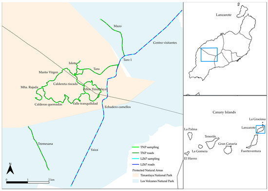 We worked on two types of roads: asphalted roads (roads) and dirt tracks (trails). Out of the fourteen zones analyzed, only two of them were trails (Mazo and Tremesana) located in the Los Volcanes Natural Park. The first one is a public trail that is used by walkers, vehicles, and bicycles. The second one is a private trail, where access is restricted to vehicles entering the national park and to the owners of fruit trees within the park. Walkers can also access and walk the trail to the boundary where the national park begins. The twelve remaining zones comprise only roads. Along the road LZ-67 (Figure 5), which is a major via, with very fluid vehicle traffic, that provides access to the national park and connects the populations of Yaiza, Manchas Blancas, and Tinajo, we analyzed 34 transects. The rest of the zones (67 transects) are located within the Timanfaya National Park, and all, except Taro and Islote, are only accessible by buses than run every day for a maximum of eight-and-a-half hours, providing tourists with a tour of the volcanic landscape. Other types of traffic are banned in the interest of the conservation of the park.