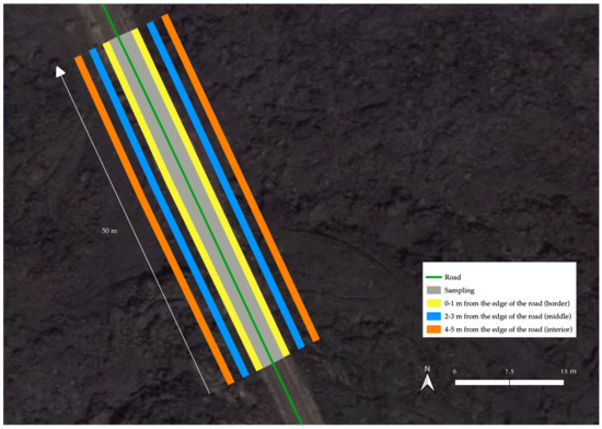 The first plot or “border” covered the first meter adjacent to the road (0–1 m); the second plot or “middle” covered the meter between 2 and 3 m away from the border; the third plot or “interior” covered the meter between the 4 and 5 m from the edge of the road. Therefore, a 1 m gap between each plot was excluded from the inventory. In this ecosystem, at a distance of 4–5 m from the edge, we considered that the effect of the road is minimal, and the natural composition of species would exist. Beyond this distance, the impact of road-related factors, such as pollutants, altered abiotic conditions, and air movements that can disperse seeds, diminishes, allowing for a more undisturbed environment [34].