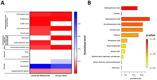 Along with UHPLC characterization, selected phenolic compounds were quantified by high-performance liquid chromatography (HPLC) analysis, and an enrichment pathways metabolomic analysis was conducted to calculate the statistical significance of differences between metabolites. Since Landa de Matamoros and Arroyo Seco displayed the highest amount of compounds, these samples were considered for the HPLC characterization (Figure 1A). For flavonols, particularly epicatechin and (+)-catechin, Landa de Matamoros samples had 23.30% higher epicatechin content than Arroyo Seco samples, and Arroyo Seco exhibited 44.96% more (+)-catechin than Landa de Matamoros samples (Figure 1A, Supplementary Table S1). In contrast, the samples contained hydroxycinnamic acids and derivatives, hydroxybenzoic acids and derivatives, and benzaldehydes and benzenoids values, which ranged between 0.6 and 12.3 μg/g (Supplementary Table S1). The enrichment pathways metabolomic analysis (Figure 1B) highlighted that, collectively, the identified and quantified compounds mainly belonged to hydroxybenzoic and m-methoxybenzoic acids pathways, whereas flavonoids-associated pathways (flavones, flavonoid glycosides; flavans, flavanols, and leuchoanthocyanins; and flavanones) displayed the lowest p-values.