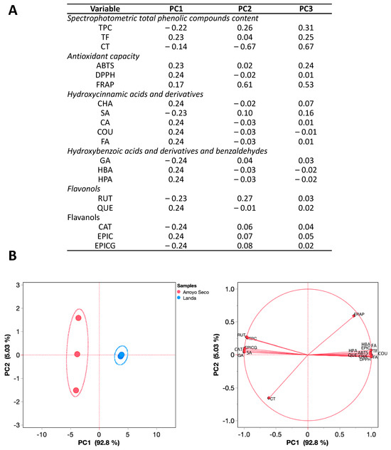 Principal components analysis (PCA) of the polyphenolic composition (HPLD-DAD) and the antioxidant capacity of P. ruderale samples from Arroyo Seco and Landa de Matamoros. (A) Participation of each principal component (PC) in the total variation. (B) Scatter and loading plots of the first and the second principal components for all the assessed samples. ABTS: 2,2-azino-bis(e-ethylbenzotiazoline-6-sulfonic acid); CA: caffeic acid; CAT: (+)-catechin; CHA: chlorogenic acid; COU: p-coumaric acid; CT: condensed tannins; DPPH: 2,2-diphenyl-1-picrylhydrazil; EPIC: epicatechin; EPICG: epigallocatechin gallate; FA: ferulic acid; FRAP: ferric reducing antioxidant power; GA: gallic acid; HBA: hydroxybenzoic acid; HPA: hydroxyphenylacetic acid; RUT: rutin; QUE: quercetin; SA: sinapic acid; TF: total flavonoids; TPC: total phenolic compounds.