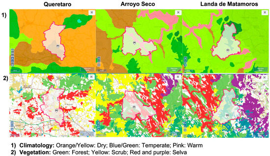 The State of Queretaro is characterized by a dry and semidry climate located in the central region (about 51% of the state’s surface); a warm, semihumid climate in the Sierra Madre Oriental region (24.3% of the state’s surface); a temperate, subhumid climate in the southern, central, and northeastern regions (23% of the state’s surface); a humid, warm climate towards the northeast (1%); and a humid, temperate climate in the northeast region (0.7%). Moreover, an arid scrub zone predominates in the central part of the state, followed in importance by coniferous and holm oak forests, in the high areas of the north, and deciduous jungle [12]. Within the state, three municipalities were selected as sampling sites (Queretaro, Arroyo Seco, and Landa de Matamoros), because each is representative of the state’s climate. Queretaro is characterized by primarily dry and temperate weather, and Arroyo Seco also contains characteristics of a semiwarm climate, whereas in Landa de Matamoros, a temperate humid, and subhumid environment is shown (Figure 4).