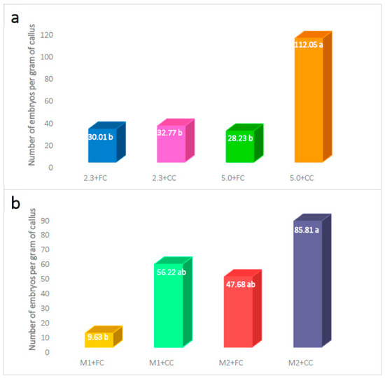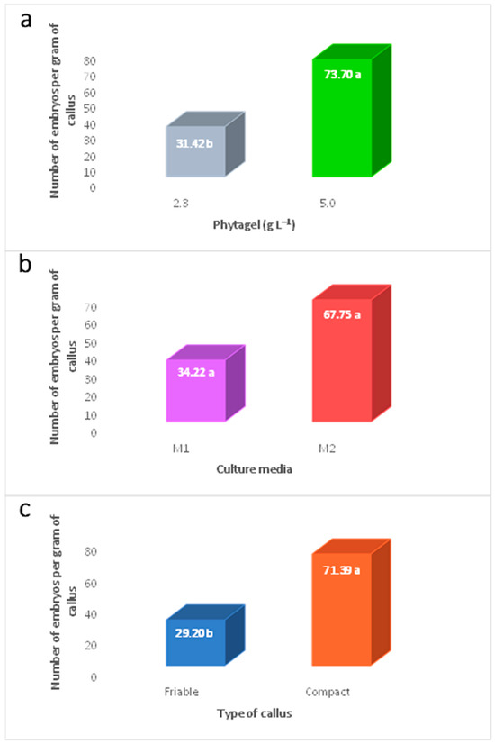 The number of embryos formed per gram of callus was significantly affected by the concentration of phytagel in the culture medium. When increasing the concentration of phytagel from 2.3 to 5.0 g L−1, the number of embryos obtained per gram of callus has doubled (Figure 2a).