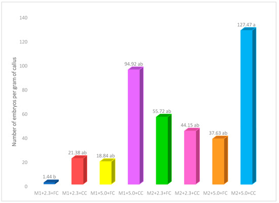 The number of embryos formed from the calli obtained in the M2 medium (1.0 mg L−1 2,4-D; 1.0 mg L−1 BAP) was higher (67.75) than that observed in the M1 medium (0.5 mg L−1 2,4-D; 1.0 mg L−1 BAP), without significant differences between the two (Figure 2b).