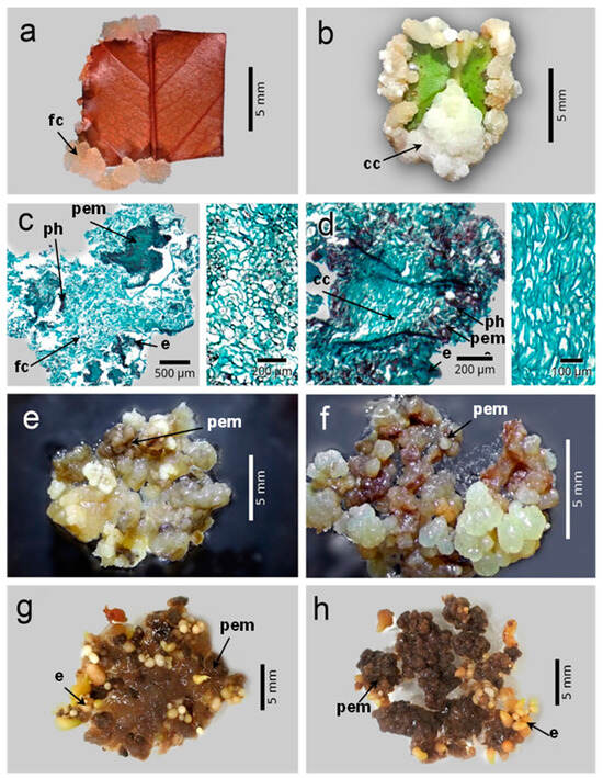 Types of embryogenic callus in Coffea arabica L. var. Colombia. (a) Friable callus at six weeks of culture. (b) Compact callus eight weeks after starting the induction stage. (c) Histology of friable callus (right, close-up). (d) Histology of compact callus (right, close-up). (e) Formation of proembryogenic masses on the friable callus. (f) Compact callus with proembryogenic masses. (g) Formation of embryos at six months of culture from friable callus. (h) Embryos formed on compact embryogenic callus after six months of culture. fc: friable callus; cc: compact callus; pem: proembryogenic masses; ph: phenols; e: embryos.