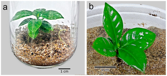 Plants of Coffea arabica L. var. Colombia regenerated by indirect somatic embryogenesis. (a) Seedlings in a mixture of perlite:vermiculite under in vitro conditions. (b) Plants growing in a greenhouse in a mix of perlite:peat:volcanic rock.