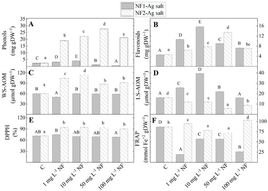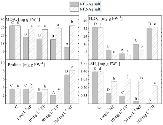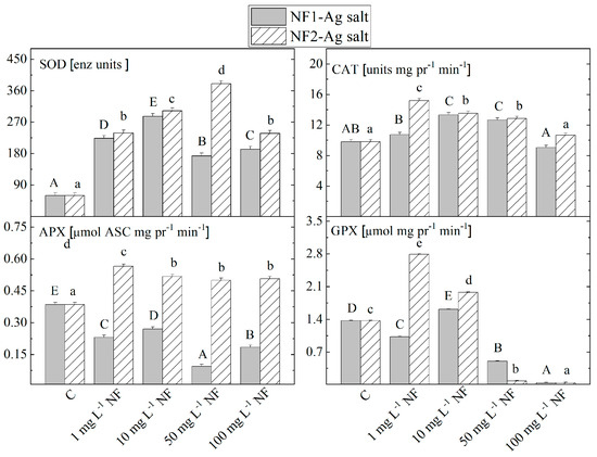 | 1 mg L−1 | 0.27 ± 0.01 d | 4.80 ± 0.081 e | 0.58 ± 0.02 e | 6.84 ± 0.05 d | 0.57 ± 0.01 e | 2.76 ± 0.07 e | 0.61 ± 0.01 e | 15.81 ± 0.01 f |