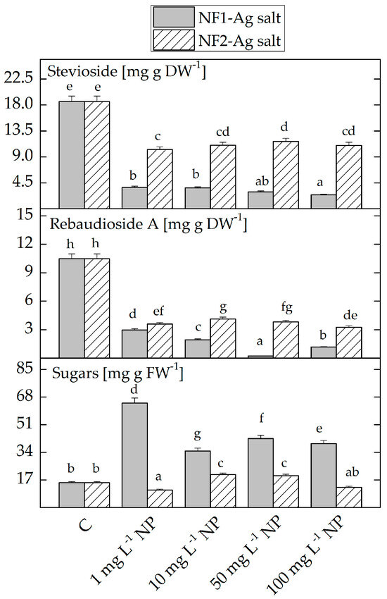 - Ramezani, M.; Asghari, S.; Gerami, M.; Ramezani, F.; Abdolmaleki, M.K. Effect of silver nanoparticle treatment on the expression of key genes involved in glycosides biosynthetic pathway in Stevia rebaudiana B. plant. Sugar Tech 2020, 22, 518–527. [Google Scholar] [CrossRef]