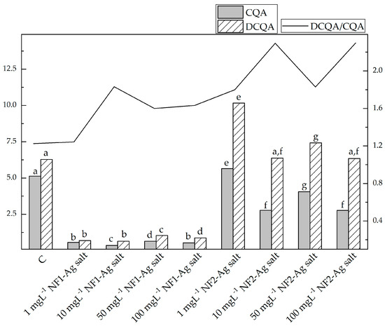| 100 mg L−1 | 0.17 ± 0.02 e | 2.33 ± 0.05 h | 0.26 ± 0.02 g | 4.17 ± 0.05 a,e | 0.40 ± 0.01 g | 1.77 ± 0.08 f | 0.32 ± 0.01 a | 9.10 ± 0.17 g |