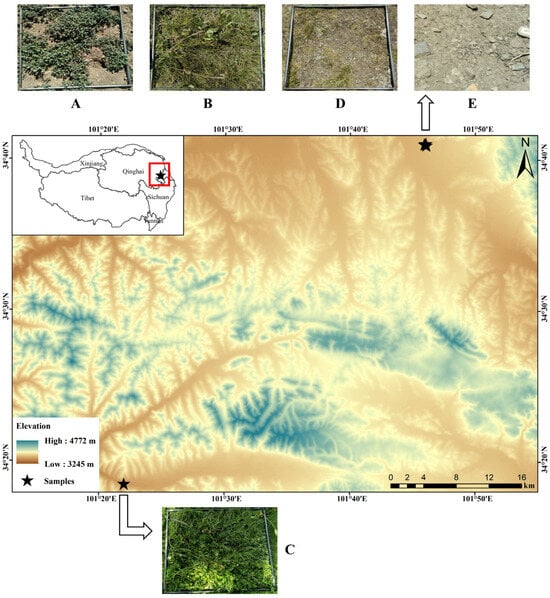 Bare patch succession stages of alpine meadow ((A) Short-term recovery patch; (B) Long-term recovery patch; (C) Healthy alpine meadow; (D) Degraded alpine meadow; (E) Bare Patches).