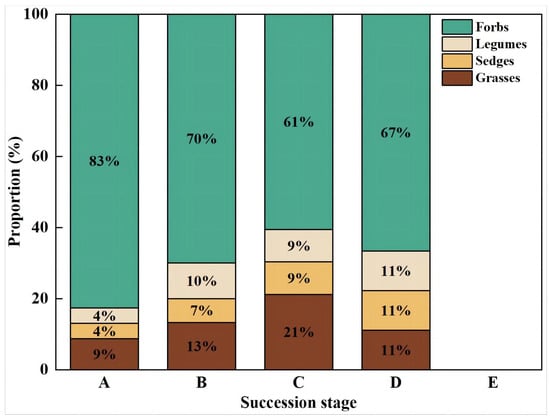 Proportion of functional group changes at four bare patch succession stages of the degraded alpine meadow ((A) Short-term recovery patch; (B) Long-term recovery patch; (C) Healthy alpine meadow; (D) Degraded alpine meadow; (E) Bare Patch).