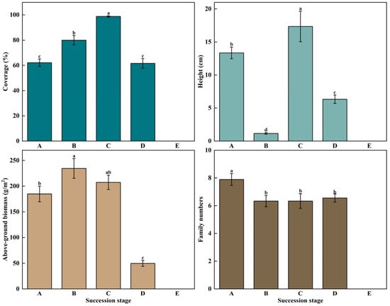 Changes of plant coverage, height, biomass, and family number in the degraded alpine meadow during bare patch succession ((A) Short-term recovery patch; (B) Long-term recovery patch; (C) Healthy alpine meadow; (D) Degraded alpine meadow; (E) Bare Patch), different lowercase letters represent significant differences in plant community coverage and biomass in the degraded alpine meadow during bare patch succession (p < 0.05).