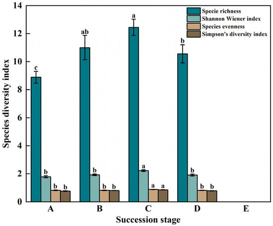 Changes of Species Diversity Index in bare patch succession in the degraded alpine meadow ((A) Short-term recovery patch; (B) Long-term recovery patch; (C) Healthy alpine meadow; (D) Degraded alpine meadow; (E) Bare Patch), different lowercase letters represent significant differences in plant species diversity in the degraded alpine meadow during bare patch succession (p < 0.05).