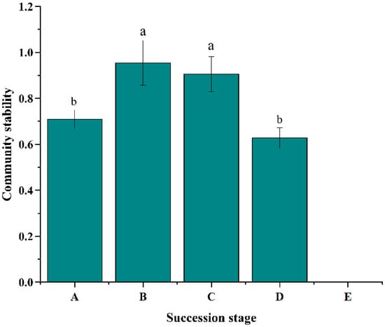 Changes in the community stability index during bare patch succession in the degraded alpine meadow ((A) Short-term recovery patches; (B) Long-term recovery patches; (C) Healthy alpine meadow; (D) Degraded alpine meadow; (E) Bare patches), different lowercase letters represent significant differences in plant community stability in the degraded alpine meadow during bare patch succession (p < 0.05).
