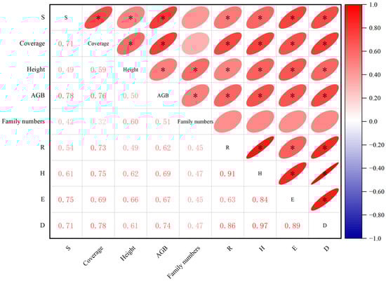 Shown in Figure 7 are the results of correlation analysis between community stability and coverage, height, biomass, family numbers, and species diversity. It can be seen that the community stability index was positively correlated with coverage, height, biomass, species richness, Shannon–Wiener Diversity Index, species evenness, and Simpson diversity index (p < 0.05). Among these, community stability had the highest correlation coefficients with cover, biomass, E, and D. This is due to the fact that communities with high species diversity are more likely to contain species with asynchronous dynamics and more stable productivity. This was followed by R and height, while correlation coefficients with Family numbers were the lowest and non-significantly positive, probably due to the insignificant effect on community stability at the plant family level.