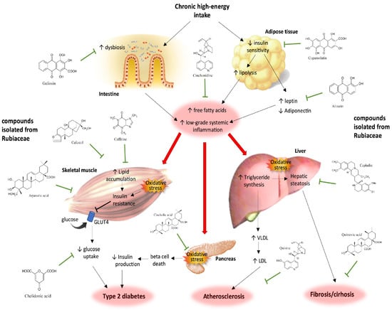 Chronic intake of high-energy diets induces intestinal microbial dysbiosis and adipose tissue hypertrophy, leading to low-grade systemic inflammation and excessive free fatty acid release into circulation. These cytotoxic molecules induce metabolic alterations in organs such as the liver, skeletal muscle, and pancreas (red arrows). Edible and medicinal plants from the Rubiaceae family contain many bioactive molecules with antioxidant, anti-inflammatory, and regulatory effects on metabolic tissues that can prevent the development and progression of non-communicable chronic diseases.