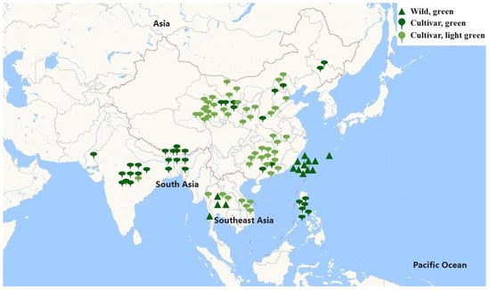 The collection of 106 lines used in this study is widely distributed in Asia. The green triangle represents the wild bitter gourd with green skin. In contrast, cultivated bitter gourds, differentiated by their green and light green skin, are, respectively, denoted by the green and light green droplet icons.