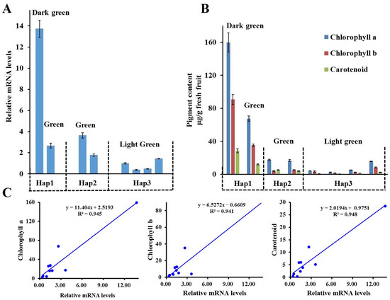 The haplotypes of McAPRR2 were identified in six accessions via Sanger sequencing. The McAPRR2 in KG113 and KG136 is Hap1, McAPRR2 in KG19 and KG29 is Hap2, and McAPRR2 in KG27 and KG44 is Hap3. The expression pattern of McAPRR2 and pigment content of the three haplotypes were analyzed. McAPRR2 expression in Hap1 and Hap2 was higher than that in Hap3, with dark green pericarp showing significantly higher McAPRR2 expression compared to green and light green pericarp (Figure 4A). Additionally, the samples used for analyzing haplotype expression were also used for pigment content assessment. The contents of chlorophyll a, chlorophyll b, and carotenoids in Hap1 were higher than those in Hap2 and Hap3, with Hap2 displaying higher pigment content than Hap3 (Figure 4B). Dark green pericarp exhibited higher pigment content than the other pericarp types. The relationship between McAPRR2 expression and the levels of chlorophyll a, chlorophyll b, and carotenoids was analyzed, revealing a positive correlation with a coefficient exceeding 0.94 (Figure 4C).