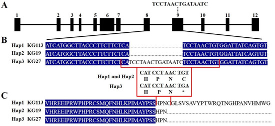 Sequencing of the McAPRR2 CDS from the three haplotypes confirmed the existence of SNP3742 and InDel4422 (Figure 5A,B). Notably, in InDel4422, a 15 bp insertion (TCCTAACTGATAATC) in exon 10 of McAPRR2 leads to a premature termination in the protein encoded by Hap3, inducing a shift in pericarp color from green to light green.
