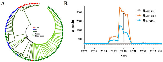 The McAPRR2 gene has undergone domestication. (A) Phylogenetic tree constructed based on 74 SNPs in the McAPRR2 gene region and promoter. The tree is clustered according to pericarp color and genetic group. (B) Analysis of nucleotide diversity in genetic group. Low πwild/SA values and high πwild/SEA and πSA/SEA values indicate that pericarp color was domesticated in SEA.