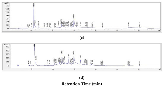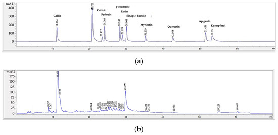 The high-performance liquid chromatography (HPLC) analysis was performed using Agilent technologies 1260 infinity (Conquer Scientific, Poway, CA, USA) equipped with Inertsil C18 column (5 mm, 4.6 × 250 mm) at 35 °C and 272 nm wavelength [10]. The gradient elution was acetonitrile and 1% acetic acid. The flow rate was 1.0 mL/min, and the injection volume was 20 µL. The phytochemical compounds being studied were the phenolic acids group (caffeic acid, gallic acid, ferulic acid, p-coumaric acid, sinapic acid, and syringic acid) and the flavonoids group (apigenin, catechin, kaempferol, myricetin, quercetin, and rutin).