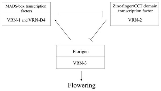 - Trevaskis, B.; Bagnall, D.J.; Ellis, M.H.; Peacock, W.J.; Dennis, E.S. MADS box genes control vernalization-induced flowering in cereals. Proc. Natl. Acad. Sci. USA 2003, 100, 13099–13104. [Google Scholar] [CrossRef] [PubMed]