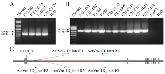 (A): Electrophoresis of the PCR products of the first intron of the Vrn-D1 gene with the primers AetVrn-D1_Intr1F2 and AetVrn-D1_Intr1R2. The 998 bp long region indicates the presence of an intact intron. (B): Electrophoresis of the PCR products of the first intron of the Vrn-D1 gene with the primers AetVrn-D1_Intr1F1 and AetVrn-D1_Intr1R1. The 747 bp long region indicates the presence of a 5437 bp deletion in the first intron. (C): The scheme of the Vrn-D1 gene and the position of the primers used. Gray rectangles, exons; black rectangles, introns; the 5437 bp deletion is in red.