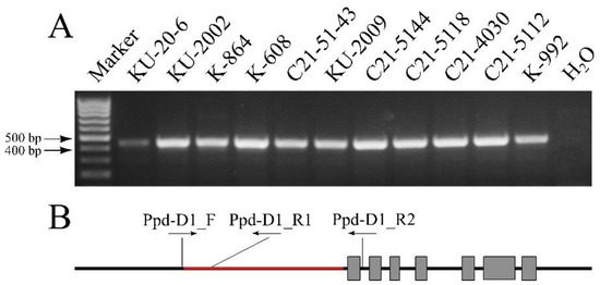 (A): Electrophoresis of PCR products of the promoter region of the Ppd-D1 gene with the primers Ppd-D1_F and Ppd-D1_R1. The presence of a 454 bp fragment indicates the absence of deletions upstream of the Ppd-D1 gene promoter. (B): Scheme of the Ppd-D1 gene and the position of the primers used. Gray rectangles, exons; black rectangles, introns; deletion 2089 bp in the promoter region is highlighted in red.