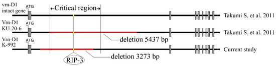 Position of deletions of the first intron of two allelic variants of the Vrn-D1 gene in Ae. tauschii. Gray rectangles, exons; black bars, introns; red bars, deletions. Yellow dots indicate the sequence of the RIP-3 region in the first intron. The designated link "Takumi S. et al. 2011" is located in the "References" section under number [62]. The critical region is the region of the first intron, where deletions lead to the development of the spring growth habit in wheat and barley [11,68,69].