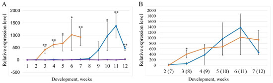 Change in the relative expression level of accessions with different alleles. Violet color indicates accession K−1740, blue—KU−2009, orange—K−992. Data for all accessions are expressed as mean value ± standard deviation (n = 3). Student’s t−test was used for testing of statistical significance (* p < 0.05, ** p < 0.01). (A): comparison of K−1740, KU−2009 and K−992. (B): comparison of K−992 and KU−2009 five weeks before heading. The expression profile is shown from the second week of development for K−992 and from the seventh week for KU−2009.