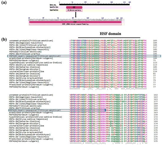 Plants are exposed to various abiotic stresses, mainly salinity, drought, high and low temperatures, chemical pollutants, etc., which adversely affect their growth and development. Heat stress (HS) is one of the major problems among the various abiotic stresses reported to date [1]. Heat stress causes outbursts of reactive oxygen species (ROS) and inactivation/denaturation of many heat-labile proteins and enzymes, which ultimately affect the growth, development, and reproduction of plants [2,3]. Heat stress has been reported to affect the pollen–stigma interaction and cause drying of stigmatic fluid, improper fertilization, and defragmentation of starch granule synthesis, which further culminates in the formation of shriveled grains with low test weight [4]. Plants have inherited defense mechanisms to cope with the vagaries of nature. Various physiochemical and molecular mechanisms operate inside the plant system in order to modulate the tolerance level in response to different biotic and abiotic stresses. The expression of stress-associated genes (SAGs)/proteins (SAPs) in response to HS is regulated by various heat-responsive transcription factors (HSFs) [5,6]. HSFs play a very important role in regulating the expression of genes linked with tolerance against abiotic stresses [7,8]. The functionality of HSFs against HS has been reported in many agriculturally important crop plants [1,9].