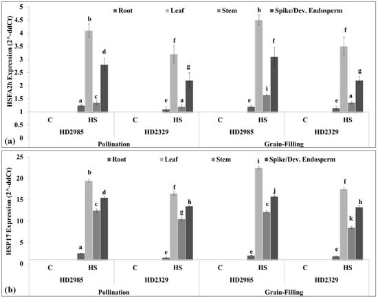 Expression analysis of HSFA2h TF and its target gene in contrasting wheat cvs. under heat stress: (a) expression of HSfA2h during pollination and grain-filling stages, (b) expression of HSP17 during pollination and grain-filling stages; C—control (22 ± 3 °C), HS—38 °C, 1 h; all data are presented as mean ± SE of three replicates, and different letters above each bar indicate a significant difference between treatments (p ≤ 0.05, one-way ANOVA).