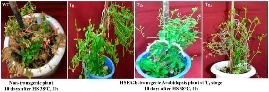 Phenotypic observation of HSFA2h TF expressing transgenic Arabidopsis plants (at T3 stage) along with wild-type plants exposed to heat stress of 38 °C for 1 h.