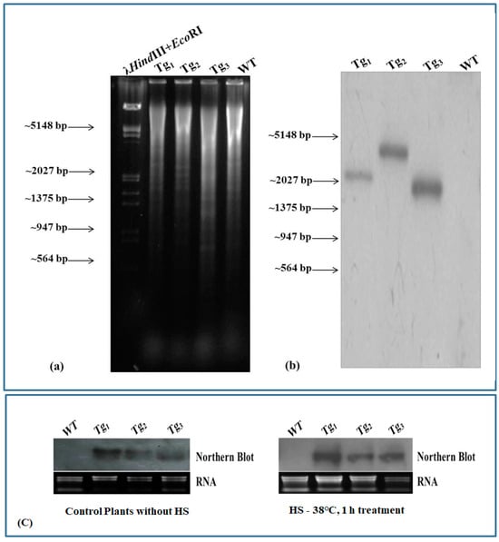 Southern and Northern blot analysis of transgenic Arabidopsis harboring wheat HSFA2h TF gene: (a) restriction analysis of isolated genomic DNA, (b) blot developed after probing with TaHSFA2h TF, (c) Northern blot analysis; WT—wild type Arabidopsis, Transgenic Arabidopsis lines—Tg1, Tg2, and Tg3 showing the integration of wheat HSFA2h TF gene; plants were exposed to HS of 38 °C, 1 h.