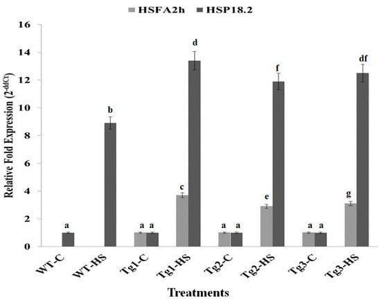 Expression analysis of HSFA2h TF and its target gene HSP18.2 through quantitative real-time PCR in WT (wild type) and transgenic Arabidopsis lines; Tg1, Tg2, and Tg3—three different transgenic lines, C—control (22 ± 3°), HS—heat stress (38 °C for 1 h); all data are presented as mean ± SE of three replicates, and different letters above each bar indicate a significant difference between treatments (p ≤ 0.05, one-way ANOVA).