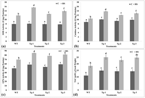 Biochemical analysis of HSFA2h TF-expressing Arabidopsis transgenic lines at T3 stage for their heat stress tolerance level: (a) superoxide dismutase (SOD) activity assay, (b) catalase (CAT) activity assay, (c) guaiacol peroxidase (GPX) activity assay, and (d) total antioxidant capacity (TAC) assay; WT—wild type, Arabidopsis transgenic lines—Tg1, Tg2, and Tg3, C—control, HS—heat stress of 38 °C for 1 h; all data are presented as mean ± SE of three replicates, and different letters above each bar indicate a significant difference between treatments (p ≤ 0.05, one-way ANOVA).