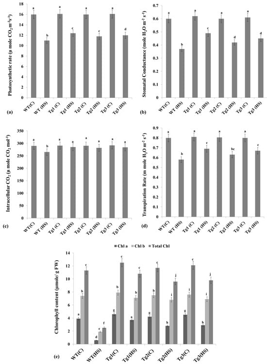 Alterations in the photosynthesis-associated parameters in WT and transgenic lines of Arabidopsis under HS: (a) photosynthetic rate, (b) stomatal conductance, (c) intracellular carbon dioxide, (d) transpiration rate, (e) chlorophyll content; C—control, HS—heat stress (38 °C, 1 h); all data are presented as mean ± SE of three replicates, and different letters above each bar indicate a significant difference between treatments (p ≤ 0.05, one-way ANOVA).
