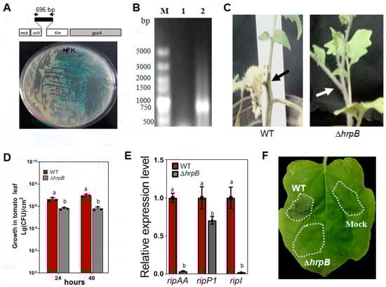 A 696 bp DNA fragment of the hrpB gene was PCR amplified using the primers hrpB-F and hrpB-R (Table S5). The PCR product was cloned into the suicide vector pK19mobGII at the Eco RI and Pst I cloning sites, generating pK19-hrpB (Table S4). The vector pk19mobGII harbors a constitutively expressed GUS gene, allowing for the determination of plasmid integration by simply observing the color of the colonies [47]. After transformation into Escherichia coli S17-1, pK19-hrpB was introduced into wild-type GMI1000 by biparental mating. The mutants with pK19-hrpB integrated into their genome were selected on NA plates containing the antibiotics Km and PB. GUS activity in the obtained ΔhrpB mutants was then examined on NA plates supplied with 20 μg/mL 5-bromo-4-chloro-3-indoxyl-b-D-glucuronide (X-gluc). To further verify plasmid integration, the primers gusA-F and gusA-R were used to amplify a 748 bp product of the GUS gene from the mutant genomic DNA (Table S5).