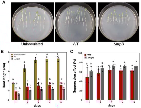 ΔhrpB exerted a suppression effect on tomato root growth. (A) Suppression of tomato root growth by ΔhrpB. Geminated seedlings of Solanum lycopersicum ‘Hongyangli’ were inoculated with a bacterial cell suspension (OD600 = 0.3) and then cultivated at 35 °C. The red line in every plate indicates the initial location of the root tip. The photos were taken at 3 dpi. (B) Primary root growth affected by ΔhrpB. The primary root length was detected at 1, 2, 3, 4, and 5 days post inoculation. Values represent the means from three replicates of 24 plants. Means ± standard deviation are plotted. Different letters at each column indicate a significant difference (ANOVA, p = 0.05). (C) Suppression effect on root growth by ΔhrpB. The data were calculated as reduced root length relative to uninoculated control plants. Values represent the means from three replicates of 24 plants. Means ± standard deviation are plotted. The letter at each column indicates no significant difference (ANOVA, p = 0.05).