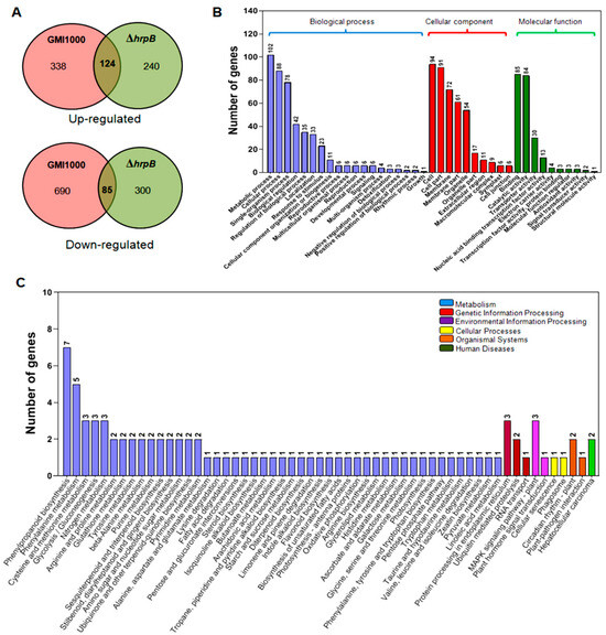 Transcriptome analysis of the differentially expressed genes in roots affected by GMI1000 and ΔhrpB. (A) Venn diagram of differentially expressed genes from pairwise comparisons between roots treated with wild-type GMI1000 and ΔhrpB. (B) Gene Ontology (GO) categories of the 209 differentially expressed genes found in roots treated with wild-type GMI1000 and ΔhrpB. The categories involved in Biological Process, Cellular Component, and Molecular Function are shown in blue, red, and green, respectively. (C) KEGG analysis of the 209 differentially expressed genes found in roots treated with wild-type GMI1000 and ΔhrpB. The categories involved in metabolism, genetic information processing, environmental information processing, cellular process, organismal systems, and human disease are shown in different colors.