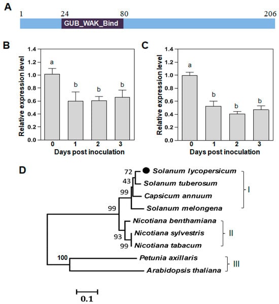 In the tomato plant genome, WAKL20 is encoded by Solyc01g100090 with a product of 206 amino acids. The cysteine-rich GUB_WAK_bind domain from 24 to 80 amino acids is an extracellular domain that binds to pectins in the cell wall (Figure 4A).