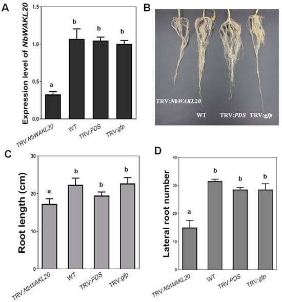 Silencing of NbWAKL20 in Nicotiana benthamiana. (A) Detection of the transcript level of NbWAKL20 by qRT-PCR analysis. The transcript levels were evaluated when TRV:PDS plants showed a photobleaching phenotype. The transcript level in TRV:gfp plants was set to 1, and the levels in silenced plants were calculated relative to that. Wildtype and TRV:PDS plants were used as controls. Values represent the means from three replicates. Means ± standard deviation are plotted. Different letters at each column indicate a significant difference (ANOVA, p = 0.05). (B) Root growth of TRV:NbWAKL20 plants. The root architecture was scored when the control TRV:PDS plants showed a photobleaching phenotype. (C) Quantification of the reduced root length of TRV:NbWAKL20 plants. Values represent the means from three repeats. Means ± standard deviation are plotted. Different letters at each column indicate the significant difference (ANOVA, p = 0.05). (D) Quantification of the number of lateral roots of TRV:NbWAKL20 plants. Values represent the means from six replicates. Means ± standard deviation are plotted. Different letters at each column indicate the significant difference (ANOVA, p = 0.05).