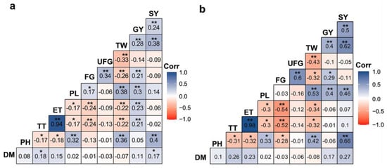 2.3. Phenotype- and Genotype-Based Correlations in the Investigated Agronomical Traits of Aus Rice Population