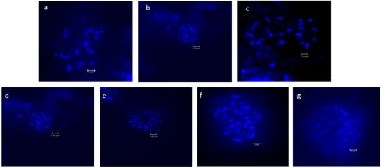 Mitotic metaphase chromosomes of Musa: (a). M. balbisiana var. andamanica, (b). M. indandamanensis, (c). M. sikkimensis, (d). M. paramjitiana, (e). M. AAB var. Champacolla, (f). M. ABB var. Meitei-hei, (g). M. AAA var. Vaibalha (scale bar 2 um).