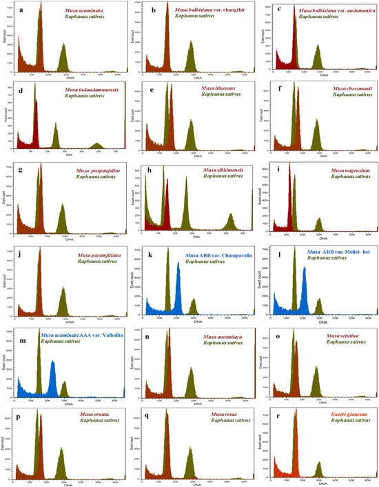 Histogram of relative nuclear DNA content, with the dominant peak corresponding to G1 nuclei of Musa and Raphanus sativus obtained after flow cytometry analysis. (a). M. acuminata, (b). M. balbisiana var. Changthir, (c). M. balbisiana var. andamanica, (d). M. indandamanensis, (e). M. itinerans, (f). M. cheesmanii, (g). M. puspanjaliae, (h). M. sikkimensis, (i). M. nagensium, (j). M. paramjitiana, (k). M. AAB cv. Champacolla, (l). M. ABB cv. Meitei-hei, (m). M. AAA var. Vaibalha, (n). M.aurantiaca, (o). M.velutina, (p). M.ornata, (q). M. rosae, and (r). Ensete glaucum.